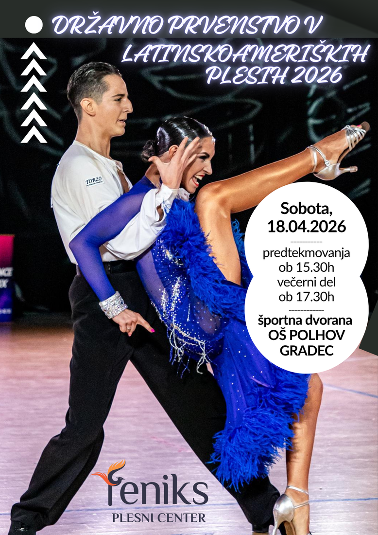v soboto, 18. 4. 2026, se bo v športni dvorani OŠ Polhov Gradec odvijalo DRŽAVNO PRVENSTVO V LATINSKO AMERIŠKIH PLESIH. Najboljši plesalci širom Slovenije se bodo predstavili v vseh starostnih kategorijah od mlajših pionirjev pa vse do seniorjev. Kot organizator pričakujemo v celodnevni prireditvi do 150 plesočih in do 300 obiskovalcev na prireditvi.