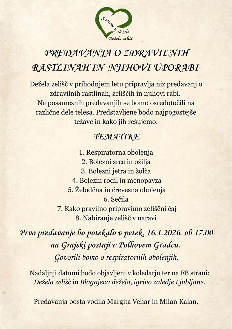 Dne 16. januarja 2026, ob 17. uri pričenjamo prvo od sklopa 5ih predavanj na Grajski postaji v Polhovem Gradcu. Prvo predavanje je namenjamo trenutno aktualnim respiratornim obolenjem. Predavatelja Margita Vehar in Milan Kalan vam bova predstavila vzroke in težave pri respiratornih obolenjih in kako jih lahko z naravnimi zdravilnimi rastlinami tudi učinkovito pozdravimo. Na voljo vam bodo tudi izdelki za domačo lekarno.
