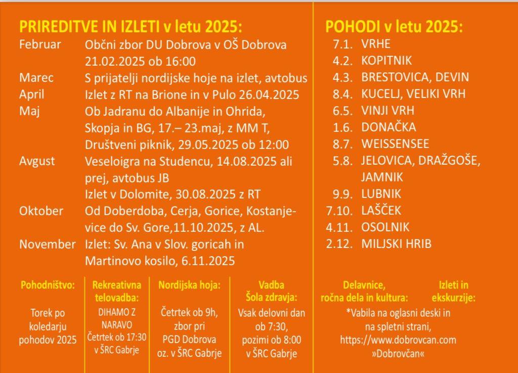 Na njihovi spletni strani Dobrovčan (https://www.dobrovcan.com/) boste našli KOLEDAR 2025 in opise planinskih pohodov, izletov in druženj ter raznovrstnih dejavnosti, ki jih osrečujejo in bogatijo njihov vsakdan.