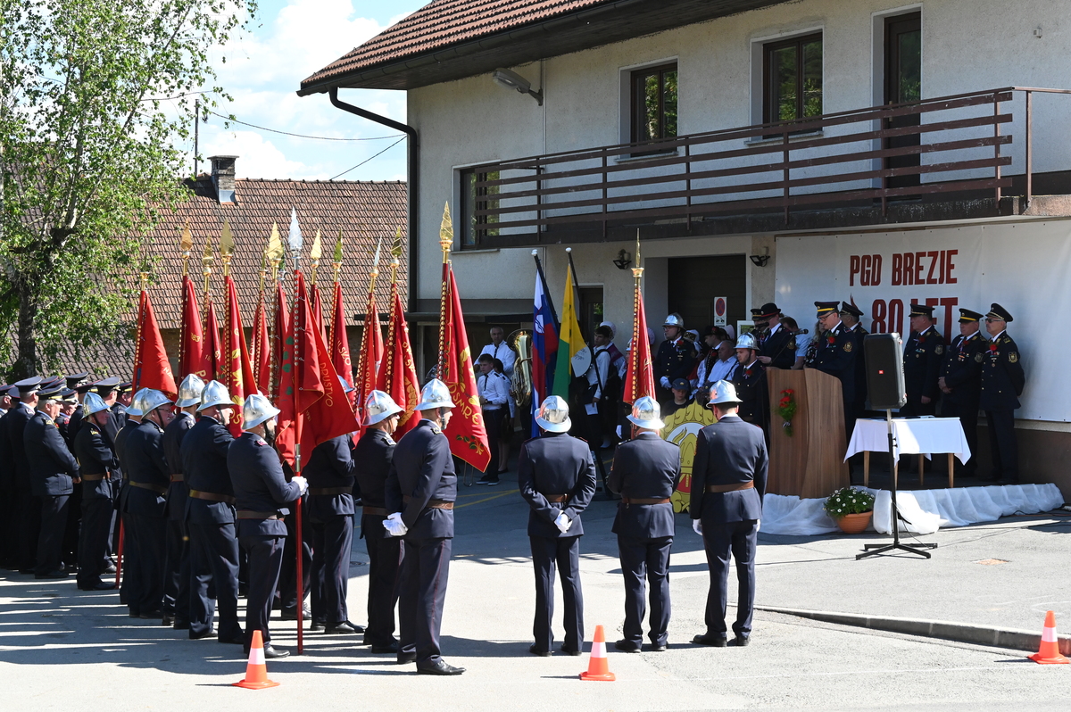 Brezje, 31. maj - Prostovoljno gasilsko društvo Brezje je s slavnostno parado in bogatim spremljevalnim programom obeležilo 80. obletnico delovanja društva. Visok jubilej so najprej proslavili s slavnostno akademijo, konec maja pa je potekala še gasilska parada in veselica z Ansamblom Banovšek. Gasilska parada se je pričela z zborom na začetku vasi, nato pa je kolona narodnih noš, godbe Dobrova-Polhov Gradec, gasilcev ter gasilskih vozil s pozdravom krenila mimo slavnostnega odra pred gasilskim domom, kjer so zbrane pozdravili številni visoki gostje in domačini.