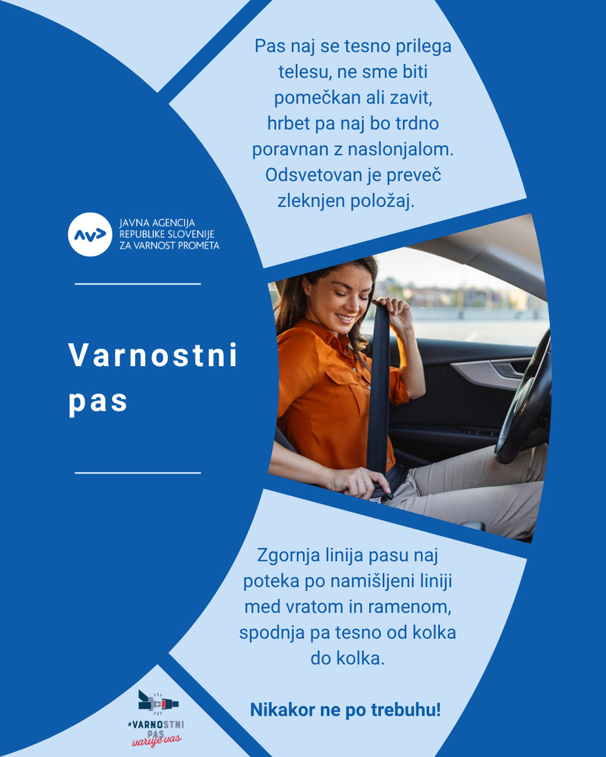 V sodobnih vozilih pasovi vsebujejo napenjalnike in omejevalnike sile, zato je pravilna namestitev ključna. Zgornji del pasu naj poteka preko rame (ne čez vrat), spodnji pa tesno preko bokov – nikakor preko trebuha.