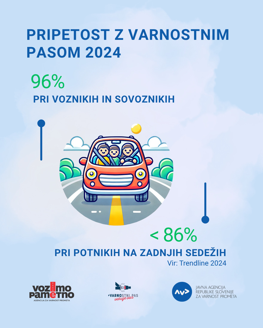 ✅ V Sloveniji sicer kar 95,4 % potnikov uporablja varnostni pas, a pri potnikih na zadnjih sedežih je odstotek še vedno precej nižji – 85,6 % (Trendline 2024).