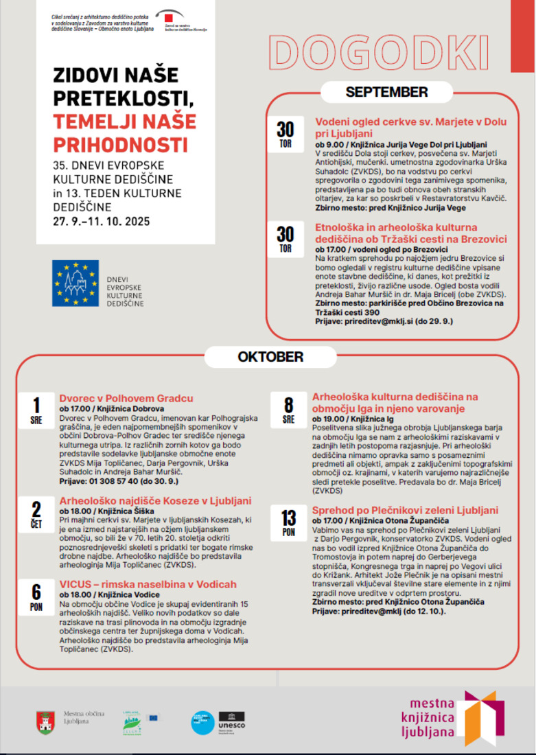 Poleg predavanja na Dobrovi organiziramo ob Dnevih evropske kulturne dediščline med 27. septembrom in 11. oktobrom 2025 še številne dogodke na drugih prizoriščih. Program si lahko ogledate v priloženem letaku.