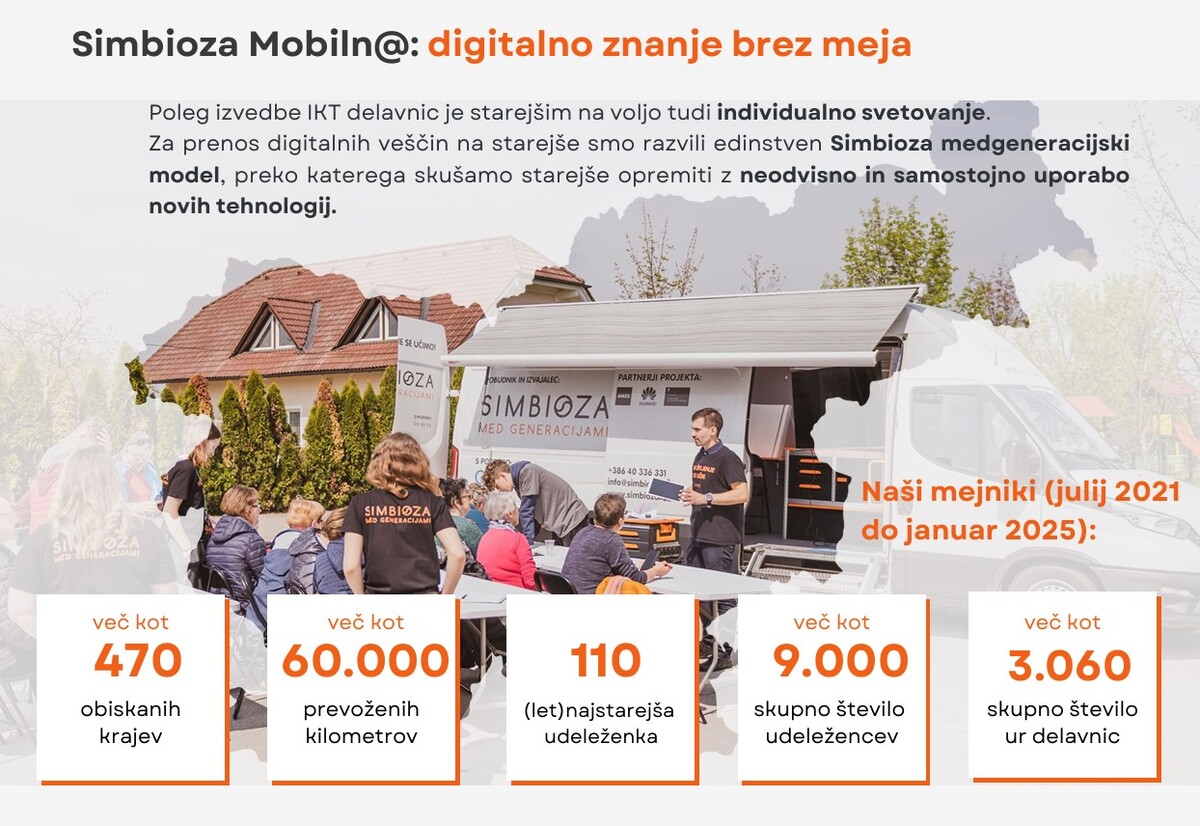 Kaj sploh je Simbioza Mobiln@? Simbioza Mobiln@ je prva potujoča učilnica v Sloveniji, ki od leta 2021 prek najsodobnejših digitalnih izobraževalnih pobud brezplačno približuje uporabo IKT orodij starejšim od 55 let, ki si želijo naučiti ali nadgraditi svoje znanje rokovanja s pametno napravo ali računalnikom. Za lažjo predstavo, kaj ponuja potujoča učilnica, si lahko ogledate predstavitveni video https://www.youtube.com/watch?v=5_jtlnQ7Uek