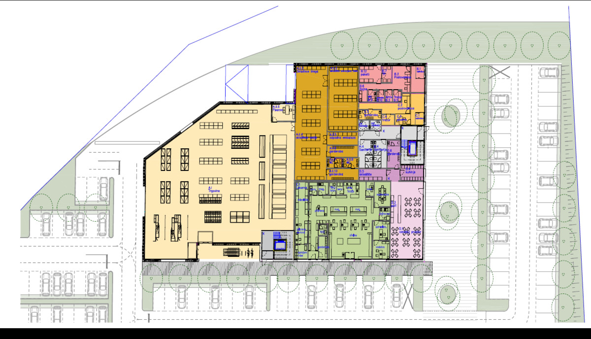 Predvidena razporeditev programov je prikazana na sliki: programska umestitev objekta v center Dobrove.