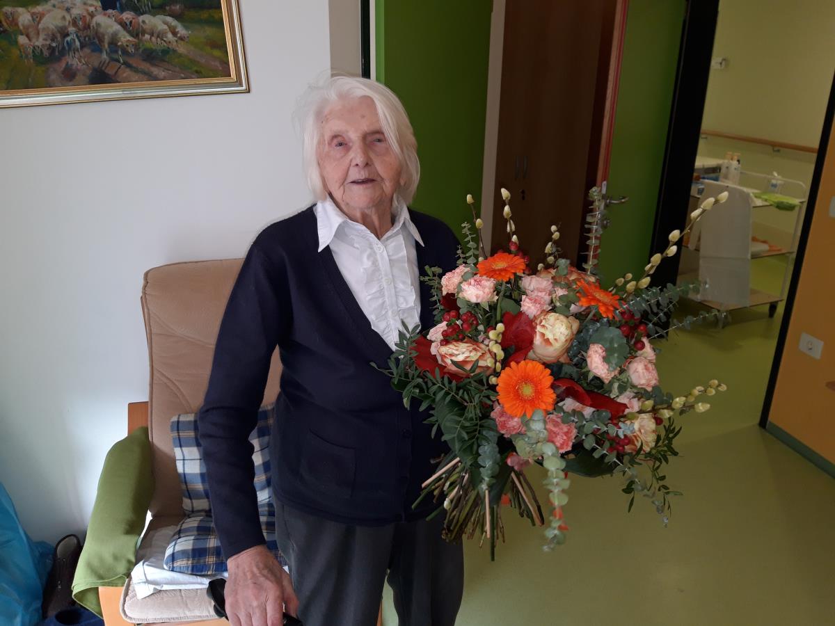 V imenu župana Franca Setnikarja so ji zaposleni Doma upokojencev Franc Salomon, enota Prebold, predali šopek cvetja ter čestitke in najboljše želje ob visokem jubileju.