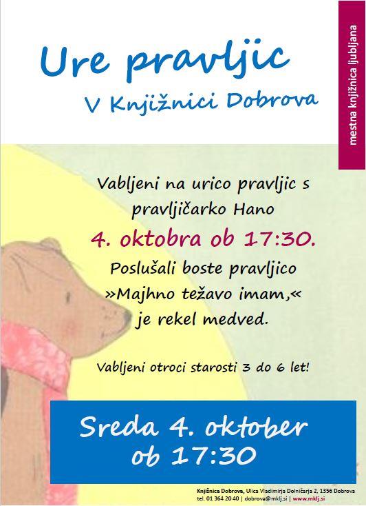 V sredo 4. oktobra ob 17:30 v Knjižnici Dobrova začenjamo novo sezono pravljičnih ur za otroke. Z vami bo pravljičarka Hana, ki bo poskrbela za zabavne pravljice, vi otroci pa pridite proisluhnit v čim večjem številu in s seboj pripeljite še očke in mamice ter dedke in babice. Več nas bo, bolj bo veselo!