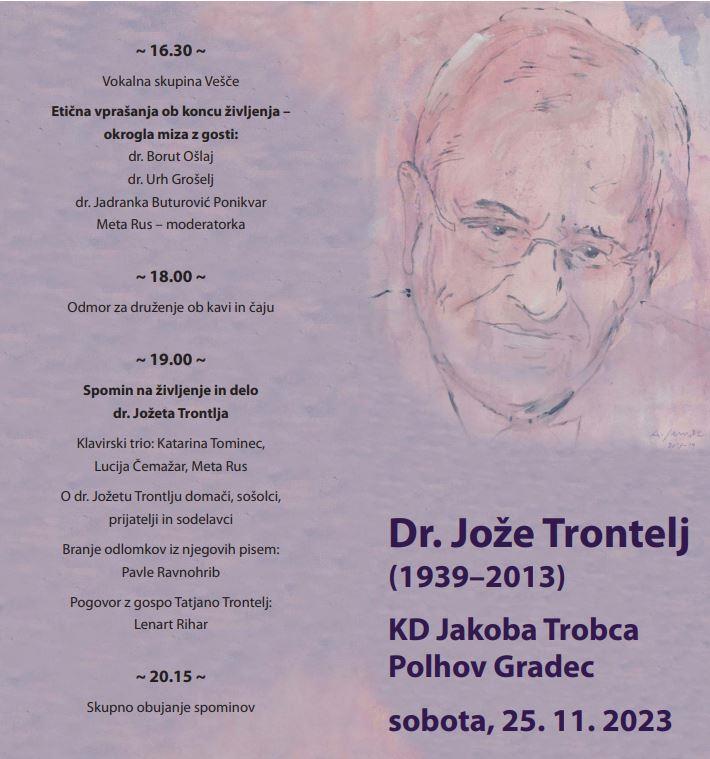 Dramsko društvo Neptun vabi na spominski večer z okroglo mizo ob 10-letnici smrti dr. Jožeta Trontlja (1939-2013), ki bo potekal v KD Jakoba Trobca v soboto, 25. novembra 2023: