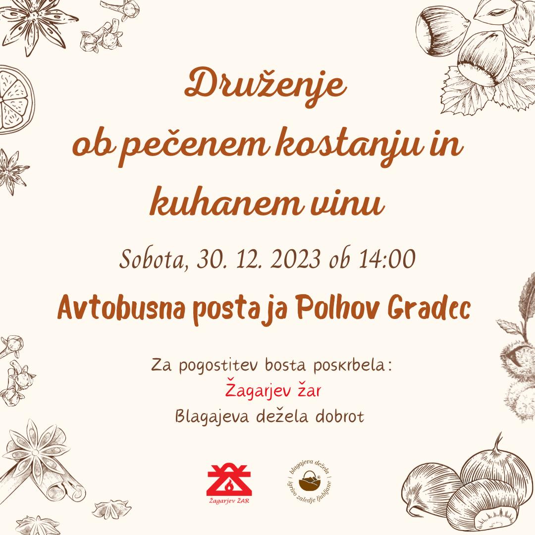 Žagarjev žar in Blagajeva dežela dobrot vabita na druženje ob pečenem kostanju in kuhanem vinu v soboto, 30. 12. 2023, od 14. ure dalje na Avtobusno postajo Polhov Gradec. Vabljeni!