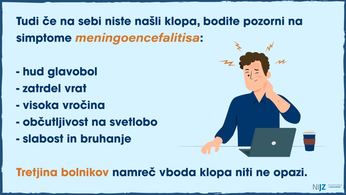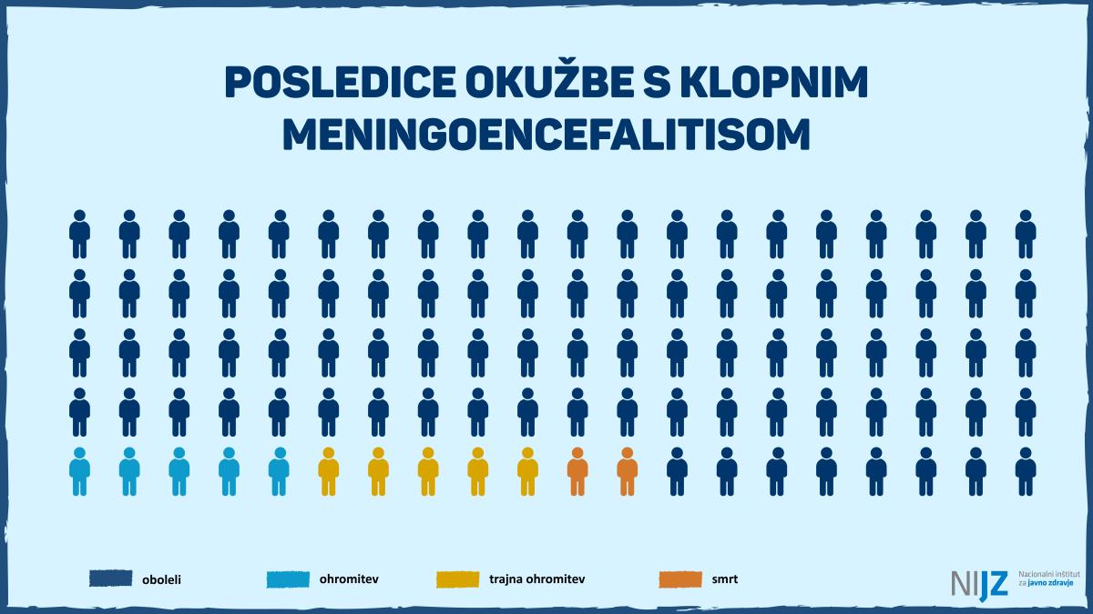 V Sloveniji v zadnjih letih beležimo v povprečju 110 primerov klopnega meningoencefalitisa letno. Ta bolezen pri desetih odstotkih obolelih vodi v ohromitve, pri polovici teh ostanejo trajne. Dobra tretjina bolnikov ima (dolgo)trajne posledice v obliki glavobolov, utrujenostji, slabšega prenašanja stresnih dogodkov, kot so motnje pomnjenja in zbranosti, motnje ravnotežja in sluha, ter tresenja. Do dva odstotka bolnikov pa zaradi meningoencefalitisa umre. Pri starejših, zlasti starejših od 60 let, se pogosteje pojavlja resen potek bolezni, ki lahko vodi v paralize in večkrat pušča trajne posledice.
