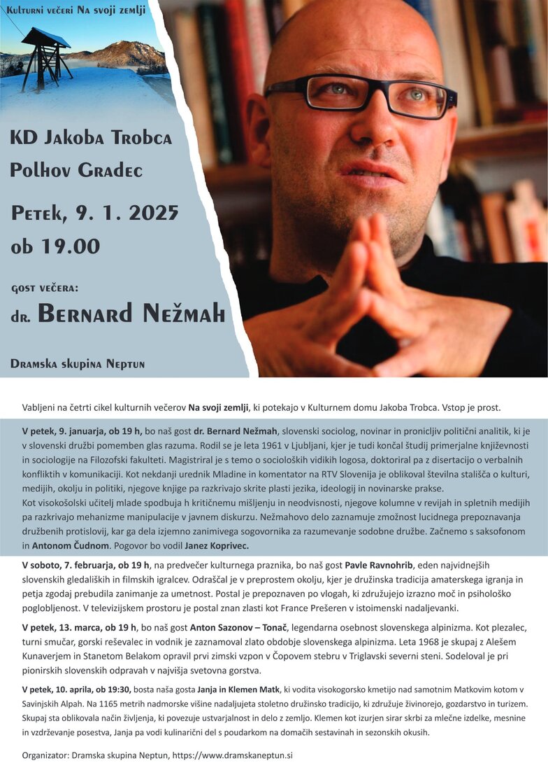 Dr. Bernard Nežmah, slovenski sociolog, novinar in pronicljiv politični analitik, je v slovenski družbi pomemben glas razuma. Rodil se je leta 1961 v Ljubljani, kjer je tudi končal študij primerjalne književnosti in sociologije na Filozofski fakulteti. Magistriral je s temo o socioloških vidikih logosa, doktoriral pa z disertacijo o verbalnih konfliktih v komunikaciji. Kot nekdanji urednik Mladine in komentator na RTV Slovenija je oblikoval številna stališča o kulturi, medijih, okolju in politiki, njegove knjige pa razkrivajo skrite plasti jezika, ideologij in novinarske prakse.