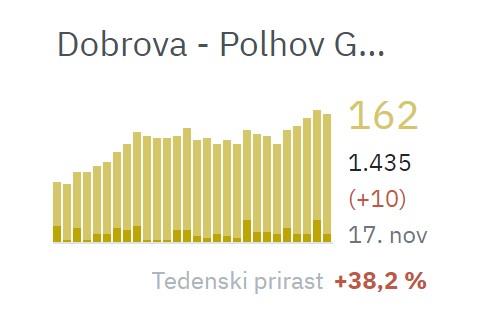Okužbe s koronavirusom ne naraščajo le na državni ravni, temveč tudi v občini Dobrova - Polhov Gradec. Kot razkriva COVID-19 Sledilnik, je bilo na dan 17. 11. 2021 v naši občini 162 aktivnih okužb, potrjenih pa 10 primerov okužbe. Skupno je od začetka epidemije za COVIDOM-19 zbolelo 1.435 občanov. Več podatkov na: https://covid-19.sledilnik.org/sl/stats