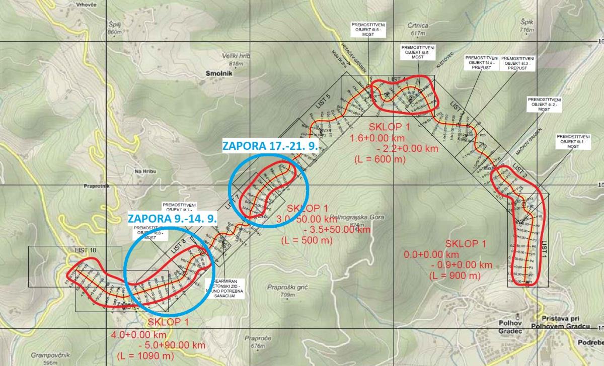 - na cesti Polhov Gradec–Zalog: od 19. 8. 2024 do 30. 11. 2024 vzpostavljena POLOVIČNA ZAPORA