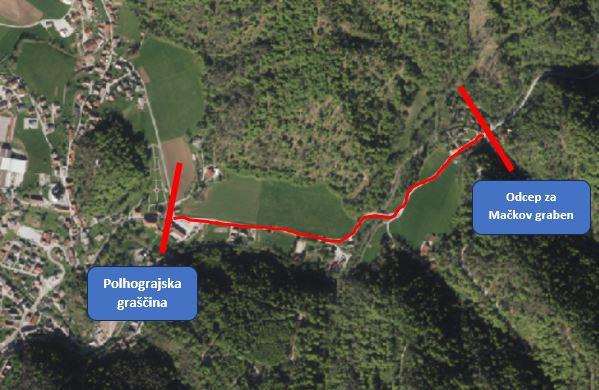 Zaradi reciklaže in asfaltiranja pa bo vzpostavljena tudi POPOLNA ZAPORA, in sicer od ponedeljka, 14. oktobra 2024, do vključno sobote, 19. oktobra 2024, na spodaj označenem območju – od odcepa za Mačkov graben do Polhograjske graščine.